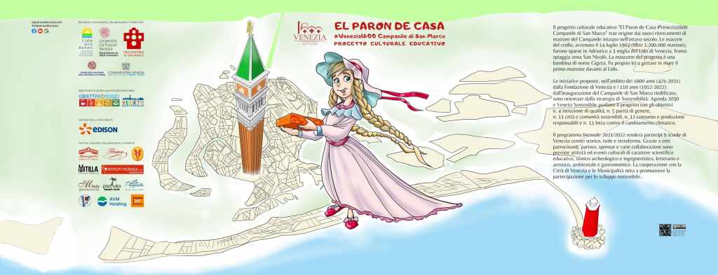 Nell’introduzione del progetto culturale educativo “El Paron de Casa #Venezia1600 Campanile di San Marco” è stata presentata la mascotte Gigeta animata dalla matita dei disegnatori veneziani Valerio Held e Maurizio Amendola. Nel 1902, a 3 miglia davanti a San Nicolò del Lido, fu proprio Gigeta a gettare in mare il primo mattone degli oltre 1.200.000 che facevamo parte dell’enorme cumulo di macerie. Allora, oltre al clamore mondiale del crollo, si fece una scoperta sensazionale. Le basi del Campanile erano state costruite con materiali di epoca greca, romana e bizantina come ben descritto dall’archeologo Giacomo Boni che catalogò numerosi reperti (SCARICA IL FILE PDF). La prima fase di edificazione risale all’ottavo secolo per iniziativa del Doge Pietro Tribuno.