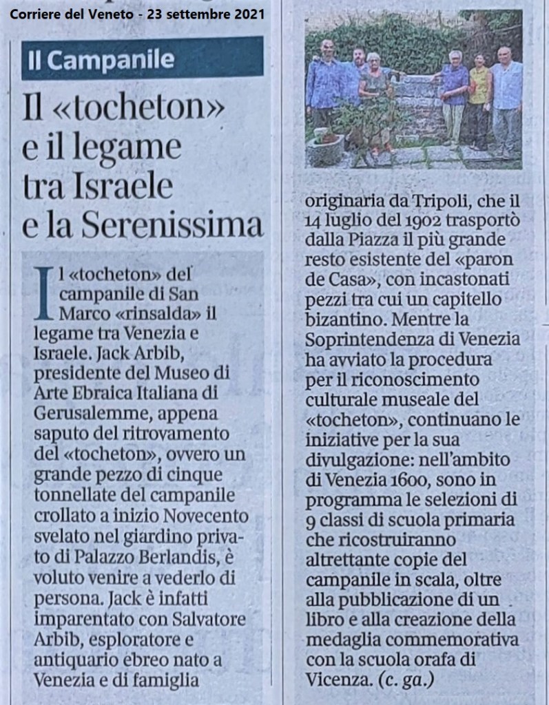 LA NOTIZIA – Il “tocheton”, cioè il grande pezzo di 5 tonnellate del Campanile di San Marco crollato a inizio ‘900, presentato il 13 luglio 2021 a Venezia nel giardino privato di Palazzo Berlendis, ha fatto clamore arrivando fino in Israele.
