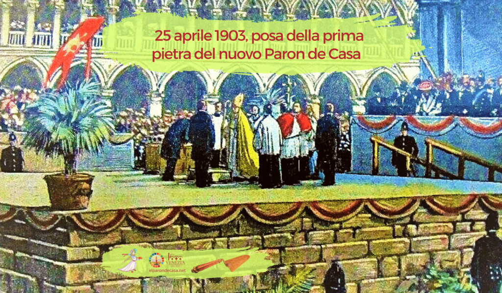 Cerimonia del 25 aprile 1903, posa della prima pietra del nuovo Paron de Casa. Ecco il discorso del Cardinale Giuseppe Sarto, Patriarca di Venezia dal 1893. Fu eletto Papa il 4 agosto 1903 e prese il nome di Pio X, proclamato poi Santo nel 1954.