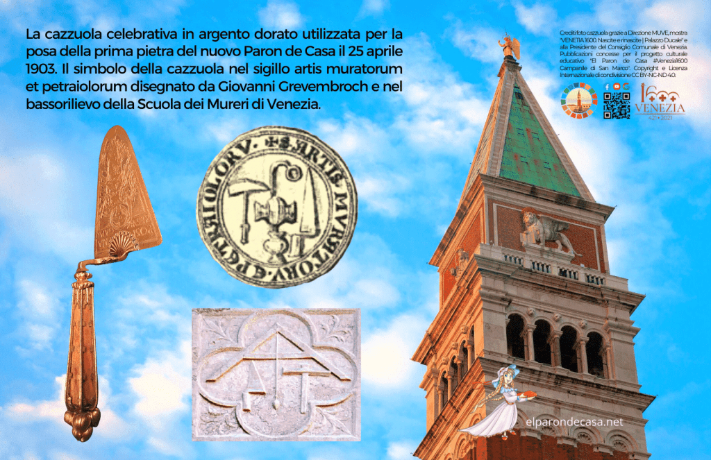 La storia della cazzuola celebrativa in argento dorato nasce proprio dalle fondamenta del Paron de Casa. Infatti, l’opera realizzata dall’incisore Alessandro Santi su disegno di Augusto Sezanne, ha il manico che trae origine da un pezzo di legno.