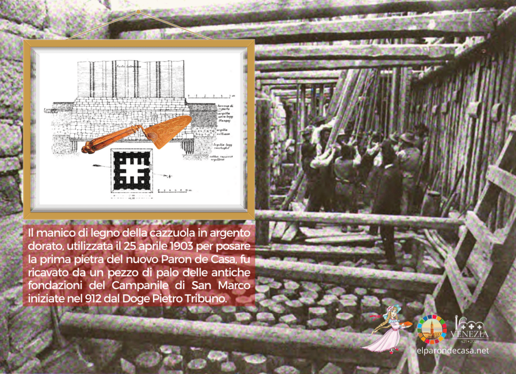 - Informazioni e immagini sulle fondamenta del Paron de Casa dal saggio di “Sostruzioni e macerie” dell’Arch. Giacomo Boni e dal reportage “Campanile di San Marco – Ricostruzione” dell’Ing. Daniele Donghi.