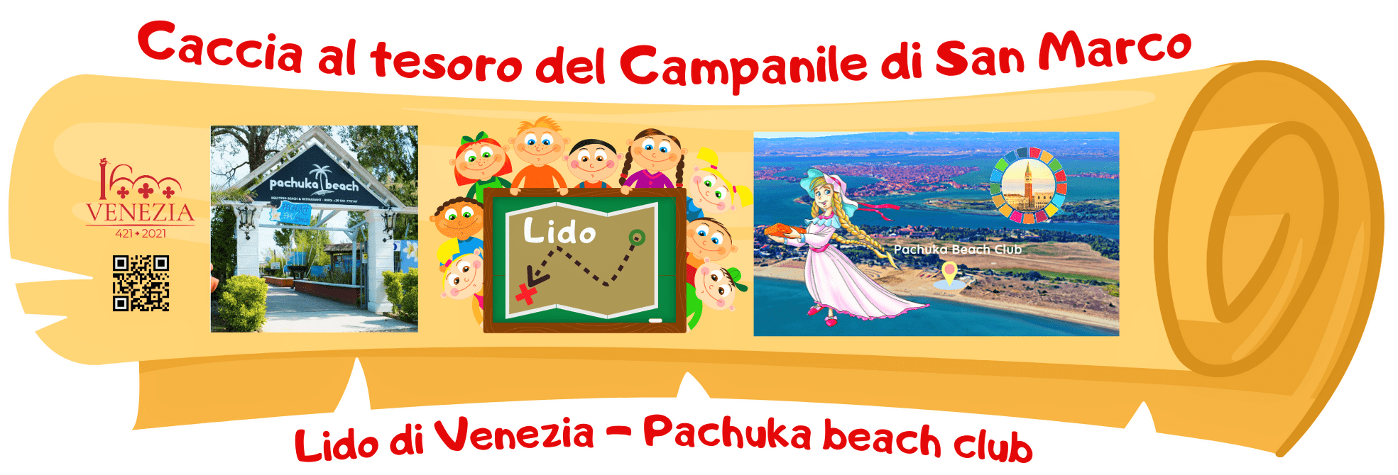 La caccia al tesoro del Campanile di San Marco dell’11 aprile al Lido di Venezia si svolge in collaborazione con Lido Oro Benon, Istituto Marinelli Fonte Venezia, Soprintendenza Archeologia, Belle Arti e Paesaggio per il Comune di Venezia e Laguna, l’Università Ca’ Foscari Venezia, Dipartimento Studi Umanistici Venezia, docenti di Archeologia, Storia Romana e Topografia Antica, studenti e dottorandi di Archeologia e Scienze e Conservazione e Tecnologie per la conservazione dei Beni Culturali, Guardia Costiera, Autorità di Sistema Portuale del Mare Adriatico Settentrionale, LIPU. Supporto e partecipazione dei partner Pachuka beach club, Gruppo AVM, Dolce Vita, Meneghetti l’orafo di Venezia, Istituti Vicenza Formazione, Muffato marmi e graniti, Consorzio Sviluppo Giudecca e gli sponsor del progetto. Edison partner per la Sostenibilità.