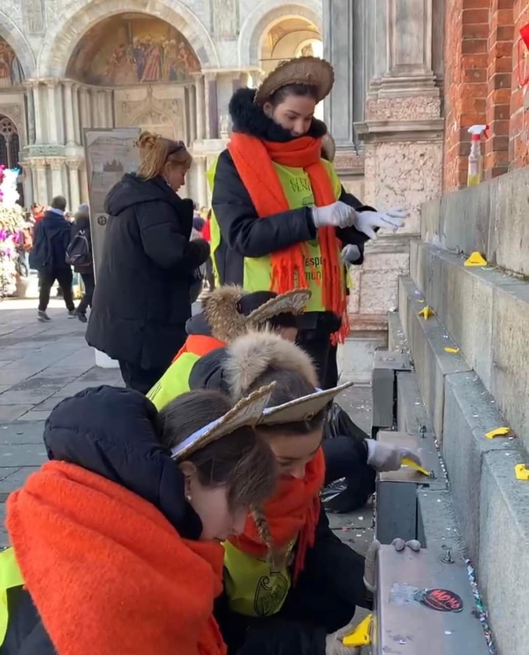 Il 12 febbraio mattina hanno pulito la base del Patron de Casa, nome affettuoso con cui viene chiamato il Campanile di San Marco, da adesivi e scritte.