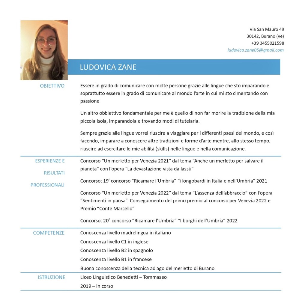 Ludovica rappresenta la nuova generazione di merlettaie buranelle in quanto è la più giovane depositaria di un’arte antica e raffinata che tutto il mondo ci invidia, cioè il merletto ad ago di Burano. Ludovica, grazie alle motivazioni e orientamenti di sua nonna Sandra e dalla bisnonna Adelina, da quasi sei anni studia per imparare l’arte secolare del merletto di Burano.