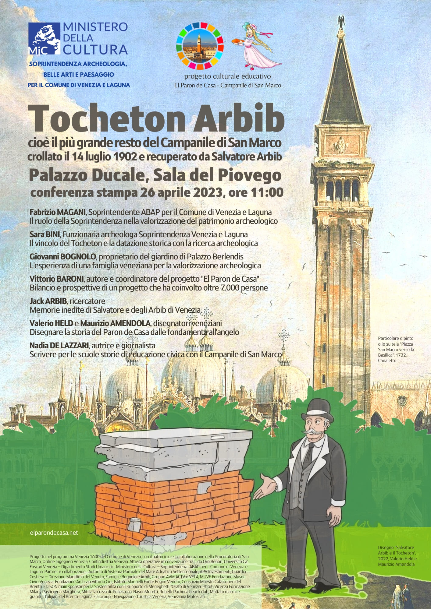 Nella conferenza stampa, organizzata il 26 aprile 2023 ore 11 alla Sala del Piovego di Palazzo Ducale in occasione dei 111 anni dall’inaugurazione del nuovo Campanile di San Marco avvenuta il 25 aprile 1912, verrà presentata la dichiarazione di riconoscimento del “Tocheton Arbib” e la procedura scientifica per lo studio del reperto con i metodi a disposizione della ricerca archeologica che permetterà di stabilire la datazione dei materiali del più grande reperto esistente del Paron de Casa crollato il 14 luglio 1902. Si presume che il Tocheton sia di epoca medievale, ma il capitello bizantino incastonato potrebbe spostare all’indietro il periodo storico. Infatti la ricerca archeologica conferma che il Campanile di San Marco fu costruito in diverse fasi a partire dall’ottavo secolo e con materiali recuperati dai veneziani dalle rovine greche, romane e bizantine.