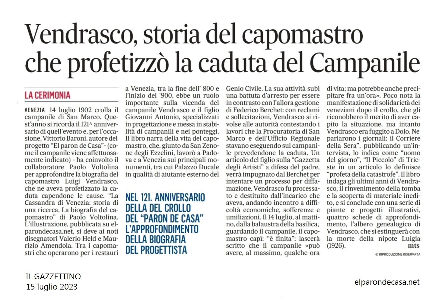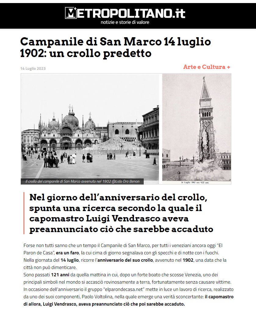 Nel giorno del 121° anniversario del crollo del Paron de Casa, così chiamiamo con affetto il Campanile di San San Marco, abbiamo il piacere di pubblicare un interessante lavoro di ricerca realizzato dal nostro collaboratore Paolo Voltolina. Disegno di copertina by Valerio Held e Maurizio Amendola.