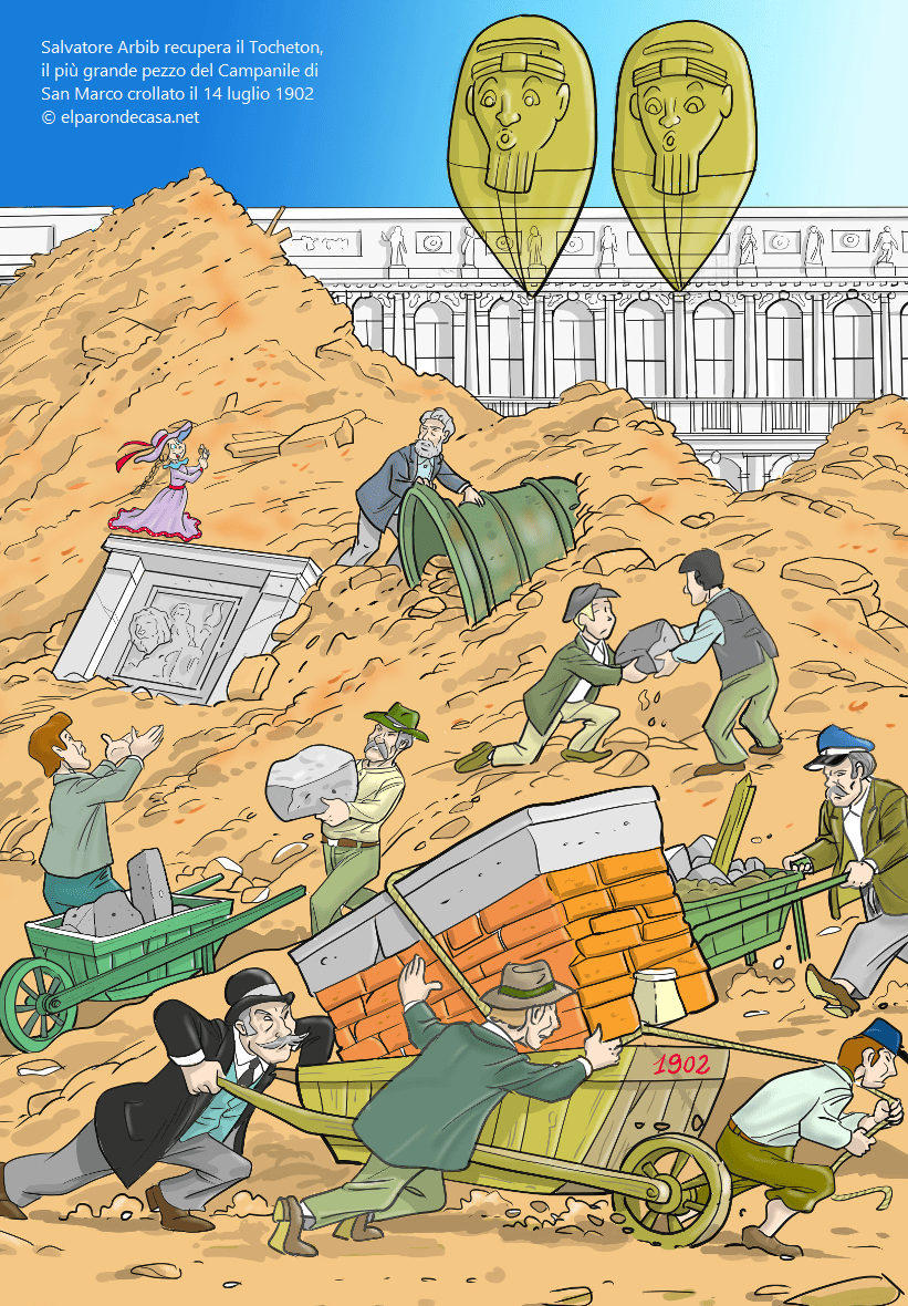 La storia del crollo del Campanile di San Marco nel 1902 non vive soltanto nei grandi frammenti custoditi come il Tocheton, ma anche nei piccoli gesti che hanno saputo fissare la memoria di quel giorno. Tra questi c’è quello della piccola Gigeta Alessandri, la bambina che al Lido ricevette il primo mattone recuperato dalle macerie e lo gettò in mare come rito simbolico, conservandone un minuscolo frammento: il suo Tochetin. Un gesto semplice, ma carico di significato, che trasformava la tragedia in ricordo intimo e personale. Accanto al Tochetin minuto e domestico, con il progetto El Paron de Casa è stato coniato il temine Tocheton associato al cognome Arbib in onore di colui che ha “recuperato e salvato” il più grande pezzo del Campanile di San Marco dopo il crollo. Se il Tochetin di Gigeta rappresenta la memoria privata, infantile e popolare, il Tocheton Arbib incarna la memoria pubblica, collettiva e monumentale. Due storie parallele che, con il progetto El Paron de Casa, si sono intrecciate ricordandoci che la memoria di Venezia vive nei piccoli e grandi gesti quotidiani delle persone.